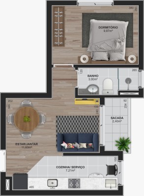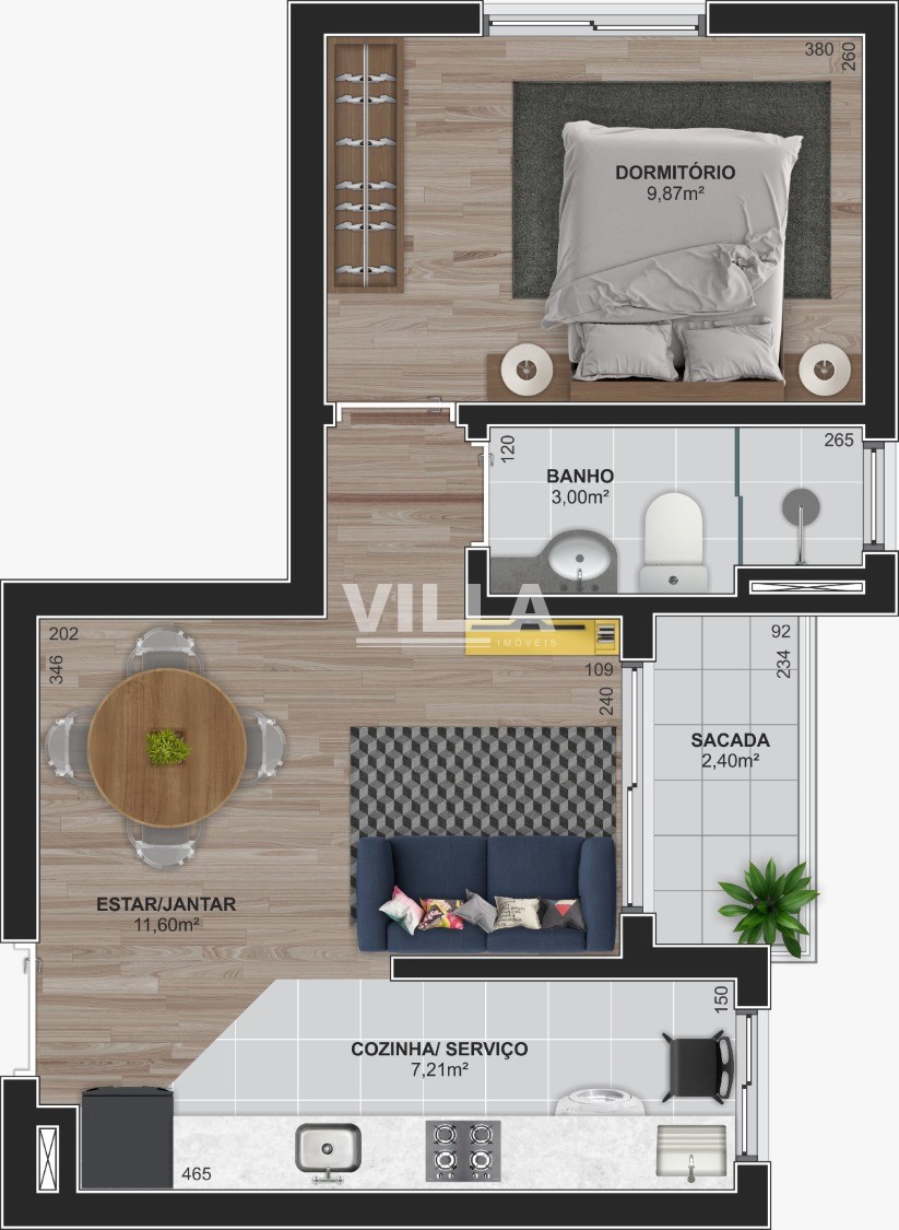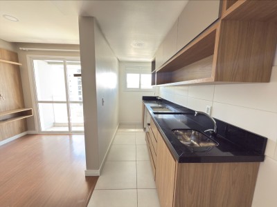 01 dormitório, sala de estar com sacada, cozinha/área, 01 banheiro e uma vaga de garagem descoberta.